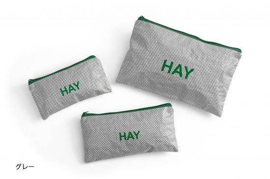HAYのロゴがあしらわれたこのポーチにはファスナーが付いており、小物を濡らさずに収納することが可能です。それぞれサイズの異なる3つのポーチがセットになっています。